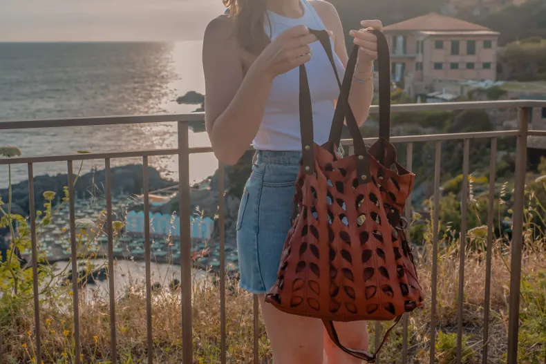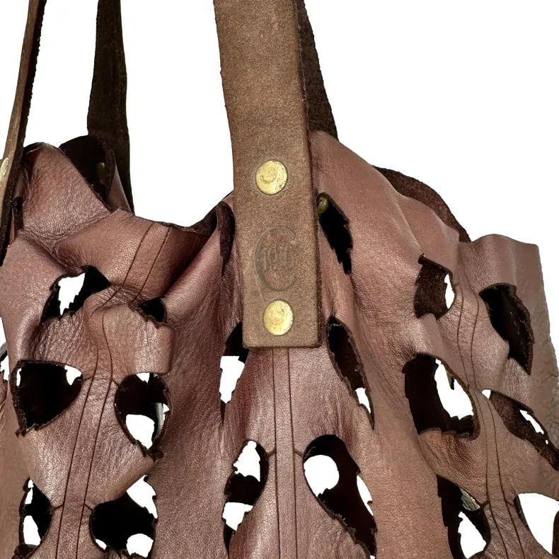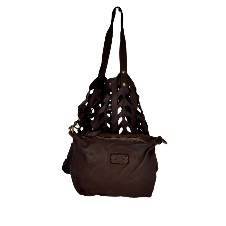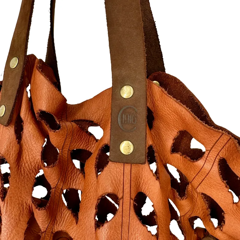 Africa: Leather shopper bag with unlined interior. Characterized by natural leaves laser pattern.