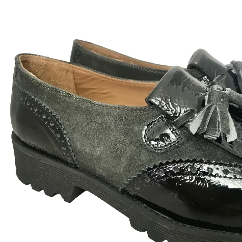 Black patent leather and anthracite suede.