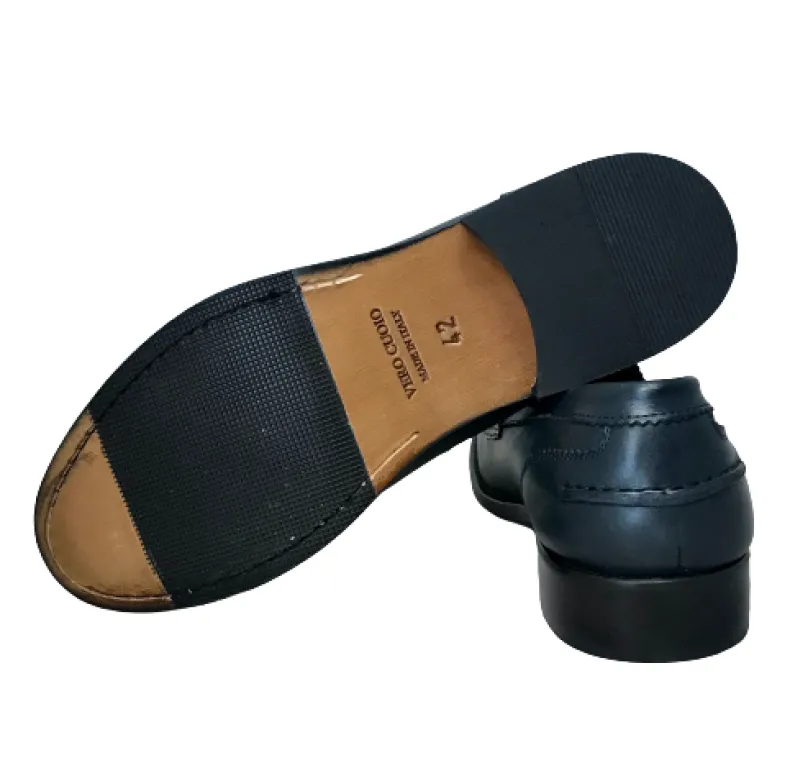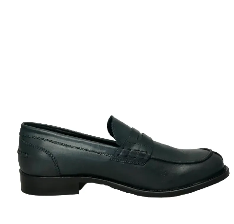 Moccasin in blue leather with leather sole with half rubber.