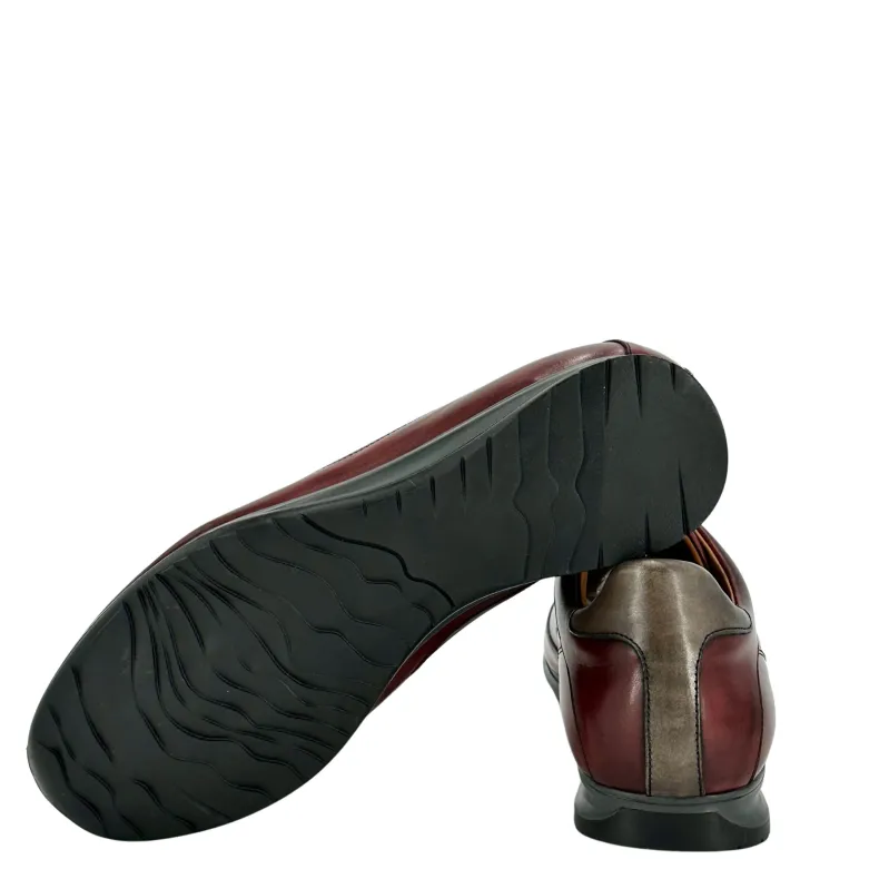 Handcrafted sneakers in burgundy leather with gray inserts.