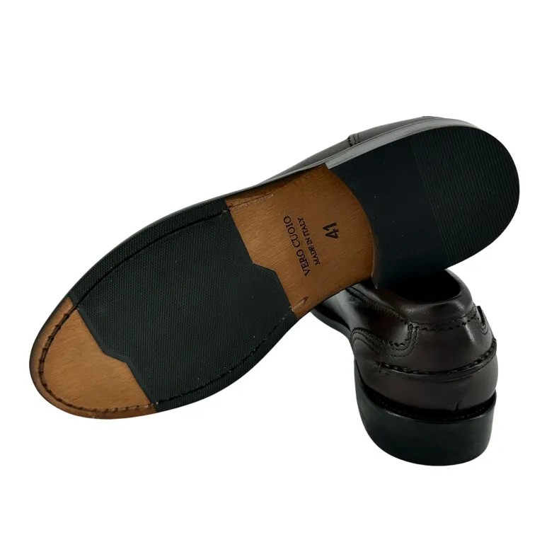 Handmade moccasin in dark brown leather with leather sole with half rubber.