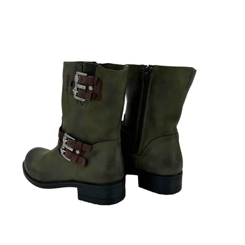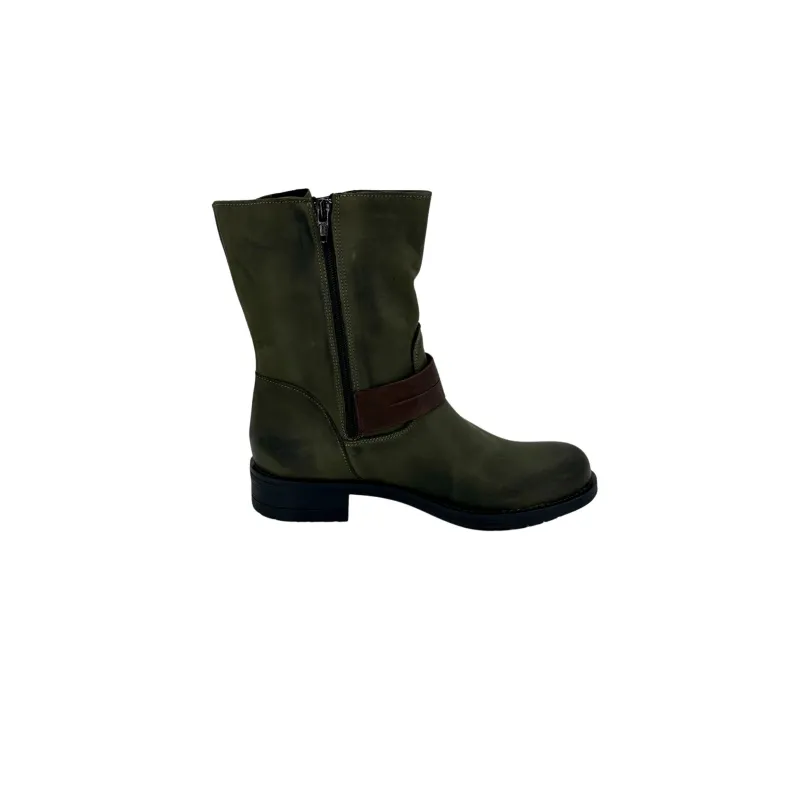 Green leather boot with brown leather details.