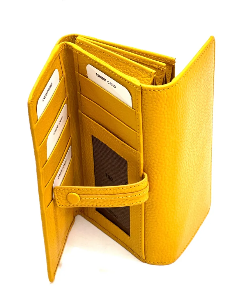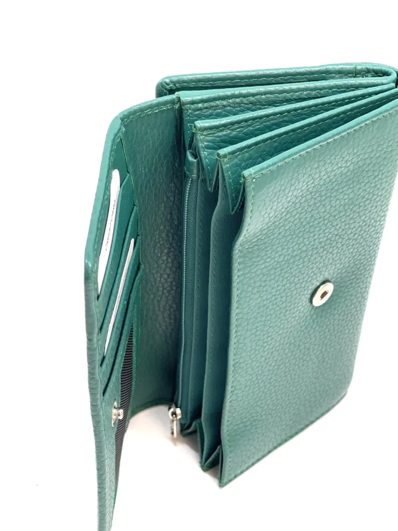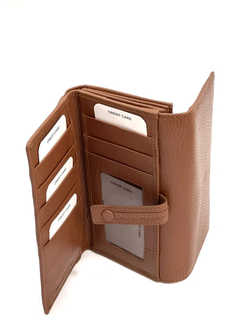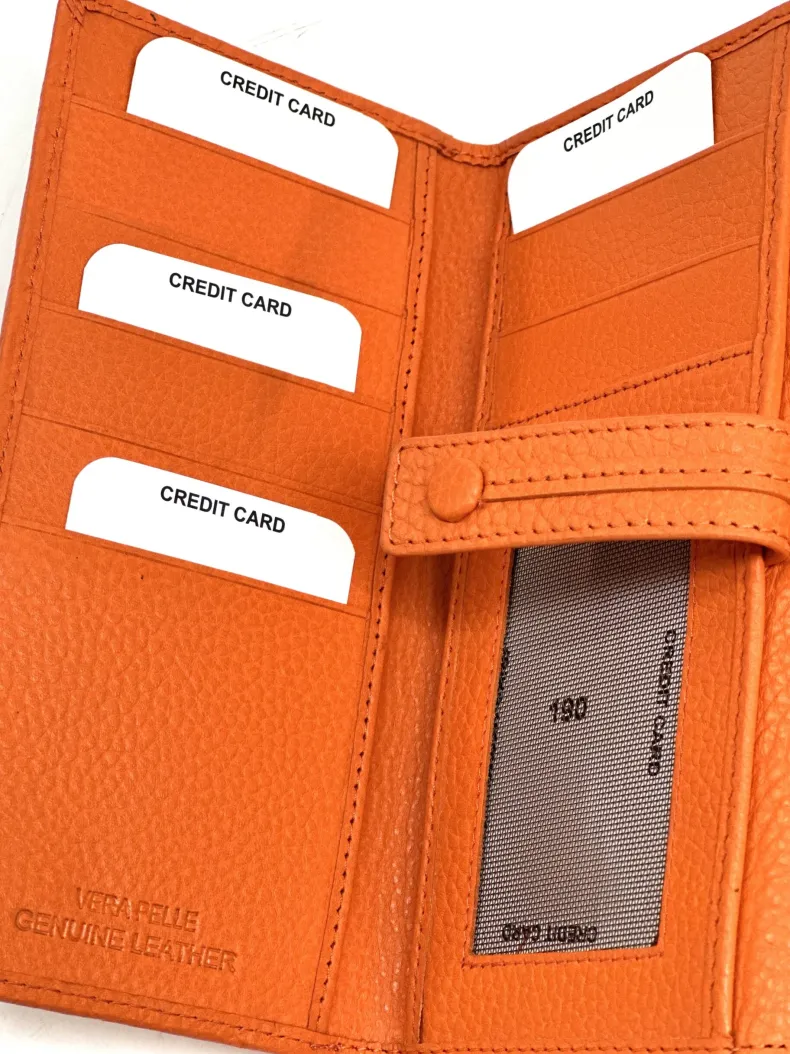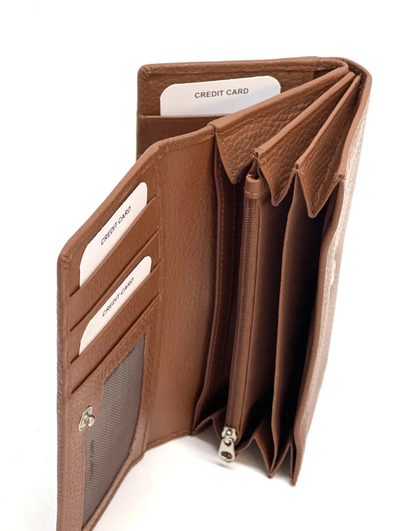 Made up of 2 parts: 3 spaces for cards/discredit cards, a transparent space for documents, 4 pockets for banknotes etc. divided by a coin pocket closed by a zip.