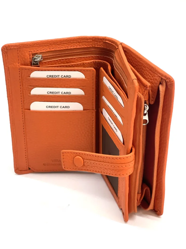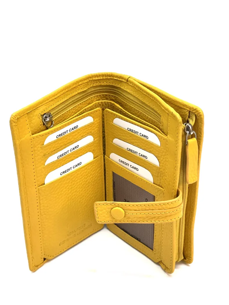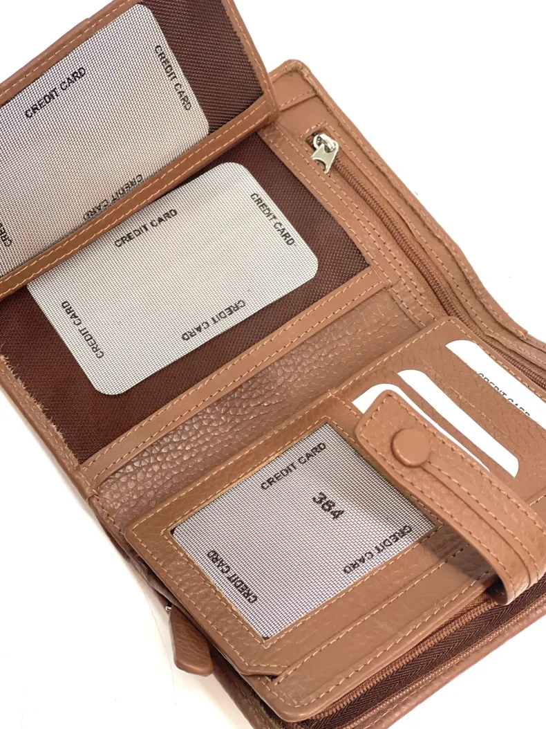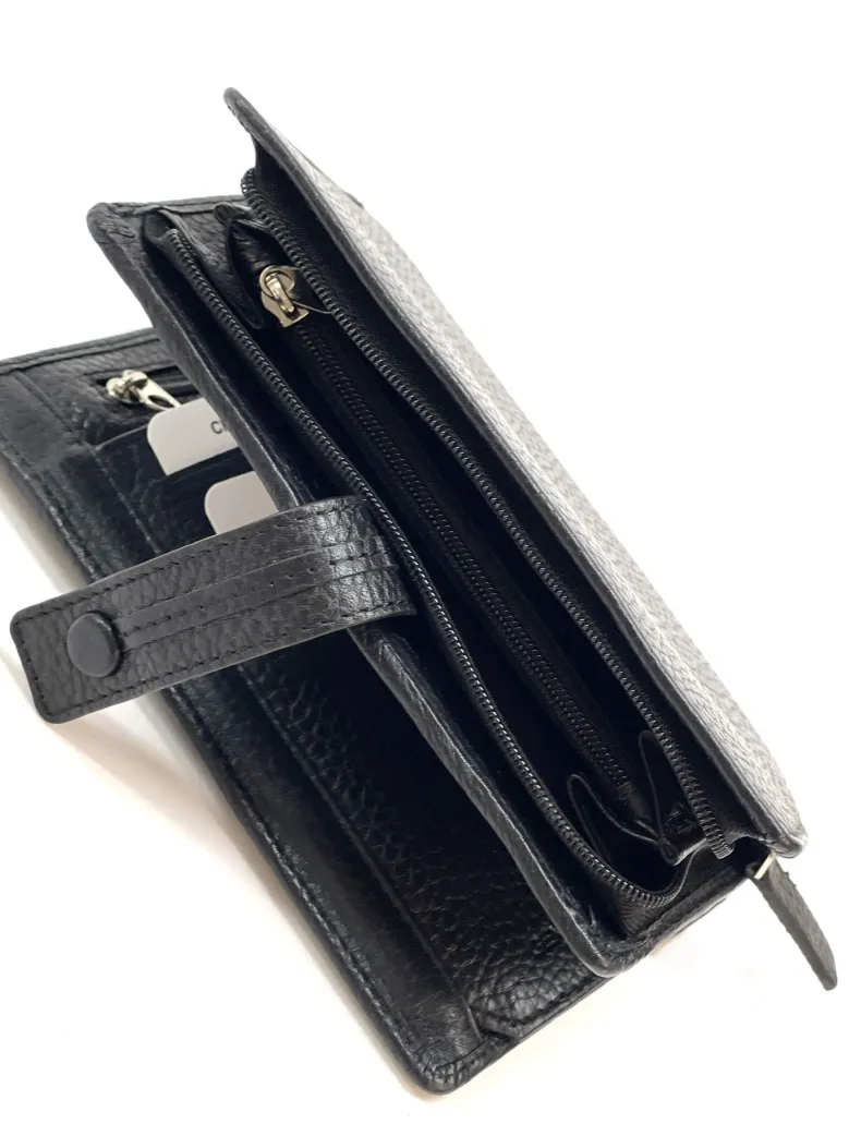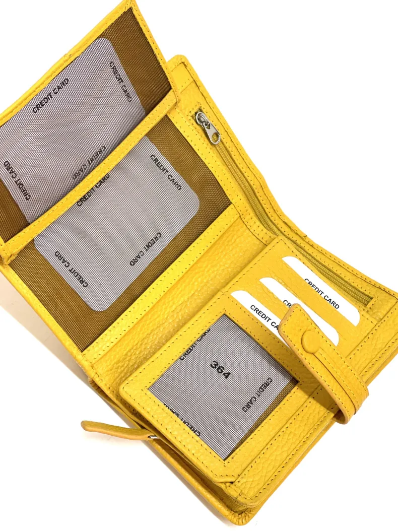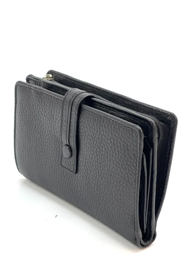 Part with button equipped with: 9 card/credit card holder spaces, 1 banknote holder space, 1 zippered pocket, 1 transparent document holder space.