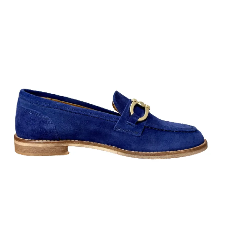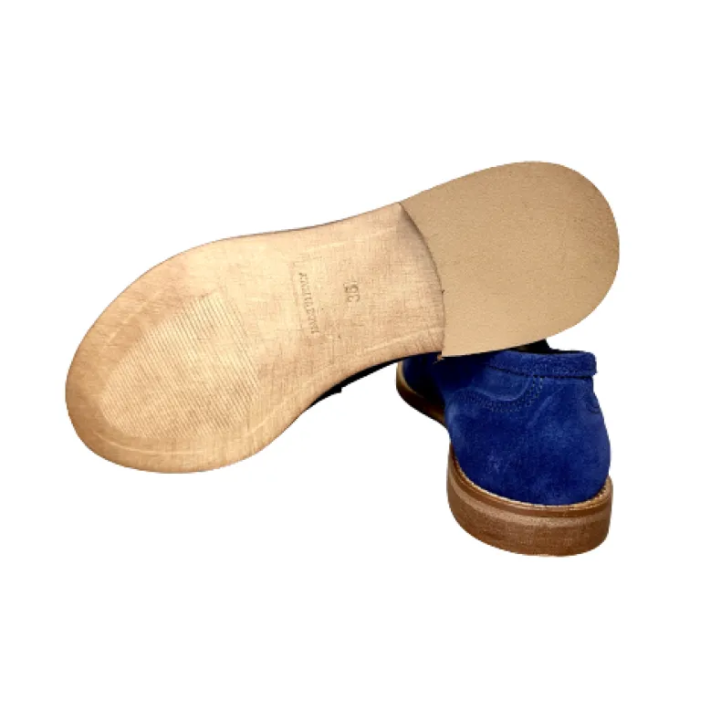Handmade moccasin in blue nubuck leather with golden clamp.