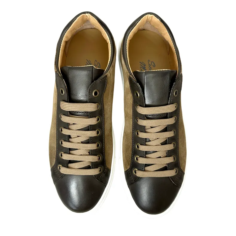 Low sneakers in dark brown leather and taupe nubuck.
