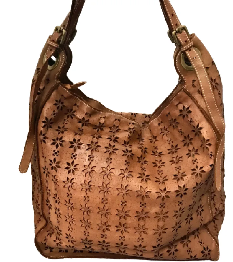 Laser-cut leather with floral print on both the front and back.