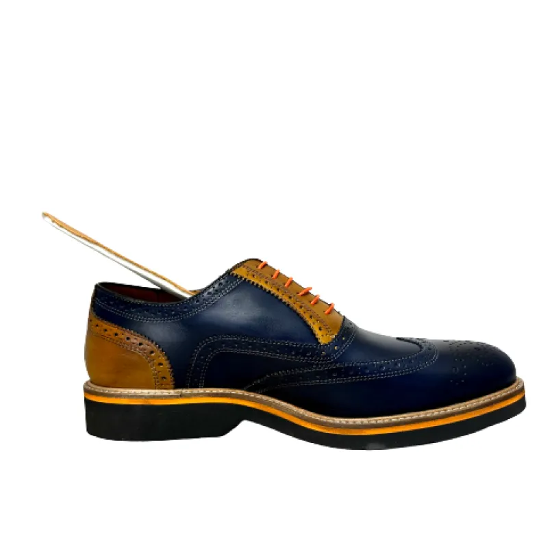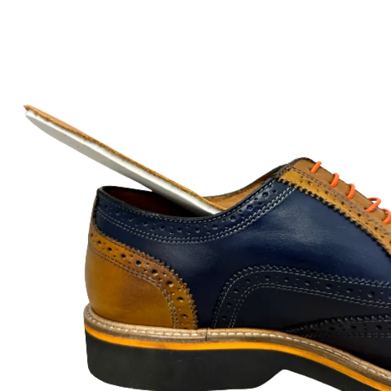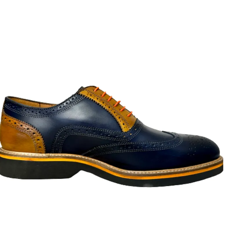 Lace-up in blue leather with ocher-colored inserts.