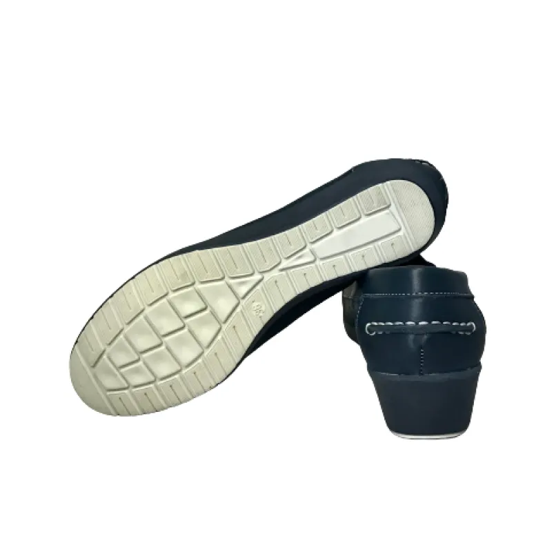 Unlined blue leather moccasin.