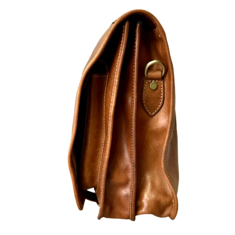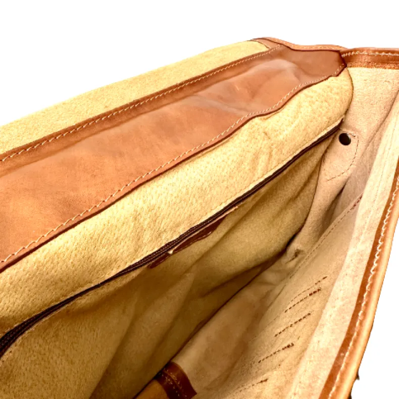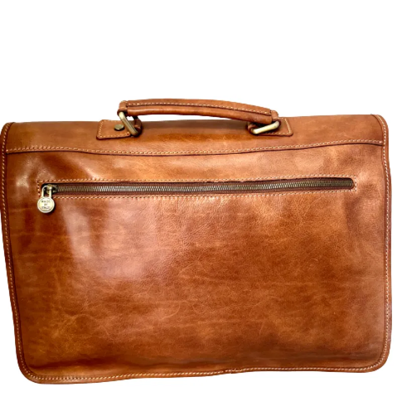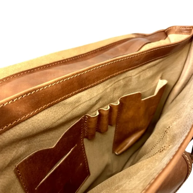 Two compartments: one of which has an open leather pocket, three leather pen holders and three leather card holders; in the other we find a large pocket closed by a zipper.