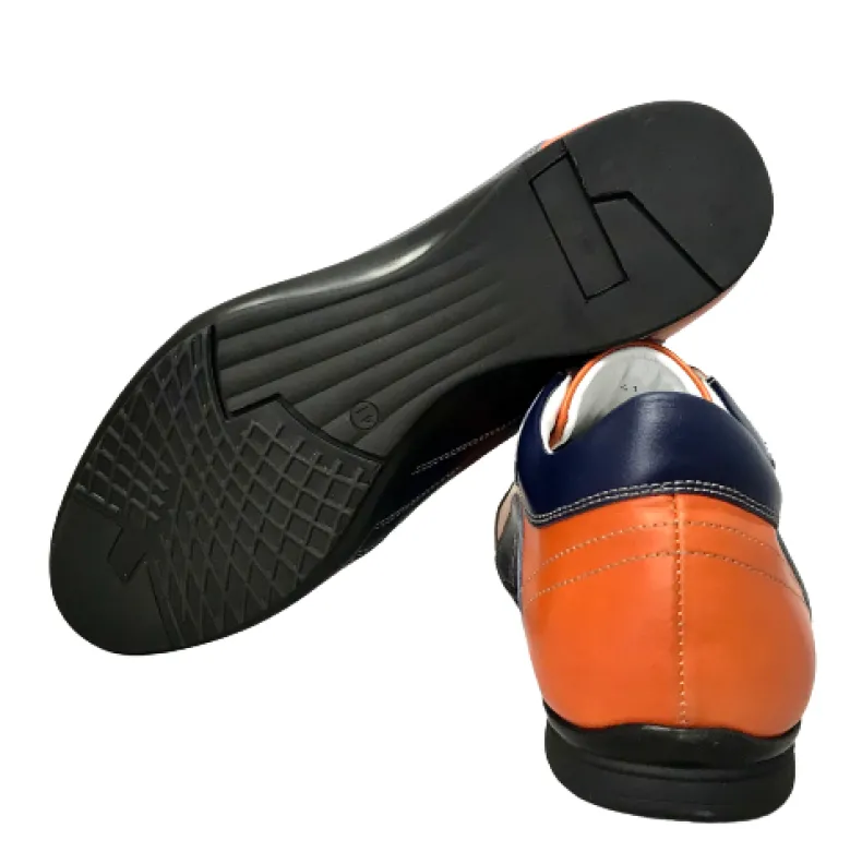 Low sneakers in orange and blue leather.
