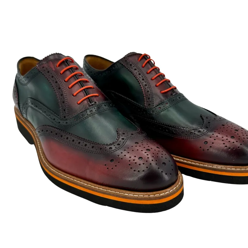 Burgundy and green leather lace-up.
