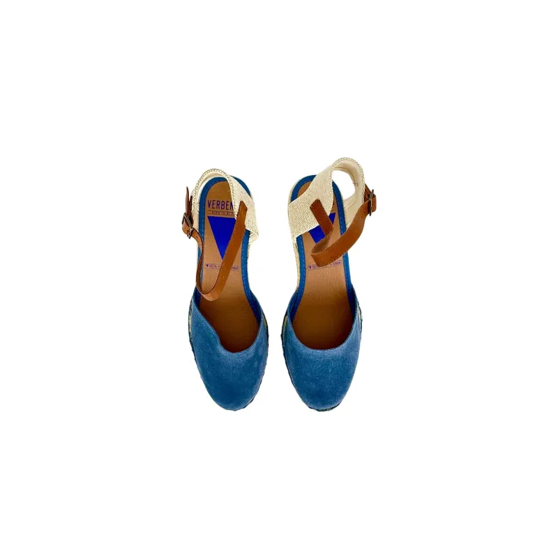 Summer wedge in blue suede, espadrilles model closed at the toe with ankle fastening.